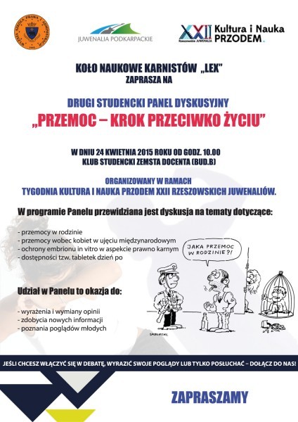 Ochrona embrionu in-vitro w aspekcie prawno-karnym, dostępność tzw. tabletki dzień po oraz przemoc w rodzinie i wobec kobiet to główne tematy Drugiego Studenckiego Panelu Dyskusyjnego „Przemoc – krok przeciwko życiu”. Dyskusja odbyła się w piątek 24 kwietnia 2015 r. o godz. 10.00. Konferencja zorganizowana przez Koło Naukowe Karnistów „LEX” odbyła się w ramach Tygodnia Kultura i Nauka Przodem XXII Rzeszowskich Juwenaliów.