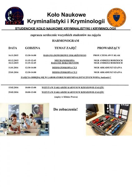 Studenckie koło naukowe zaprasza wszystkich członków oraz słychaczy na zajęcia w laboratorium kryminalistycznym WSPIA bud. C. Równocześnie odbędą się zapisy dotyczące wizyt studyjnych do Zakładu Karnego z Rzeszowie – Załężu, cieszące się zawsze wielką popularnością wśród studentów naszej Uczelni. Rozwijaj swoją pasję razem z nami!