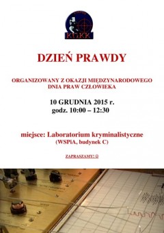 W Dniu Prawdy w Wyższej Szkole Prawa i Administracji oprócz studentów WSPiA uczestniczyli również uczniowie rzeszowskich szkół ponadgimnazjalnych. Dzień Prawdy w WSPiA poprzedza ogól polską konferencję naukową, poświęconą problematyce detekcji nieszczerości, która odbędzie się w WSPiA w dniach 11 – 12 grudnia 2015 r. Do udziału w spotkaniu zaprosiliśmy także wszystkie osoby zainteresowane tematykąbadań wariograficznych. Głównym tematem Dnia Prawdy w WSPiA były badania wykrywaczem kłamstw w kontekście ochrony praw człowieka oraz próby zafałszowania wyników badania za pomocą wykrywacza kłamstw. Dzień Prawdy w Wyższej Szkole Prawa i Administracji organizowany jest w ramach Międzynarodowego Dnia Praw Człowieka. Od kilkudziesięciu lat 10 grudnia organizowane są konferencje, akcje edukacyjne, manifestacje i konkursy uświadamiające znaczenie praw człowieka, ich treść i sposoby obrony. Szczególną uwagę poświęca się walce z prześladowaniami, głodem i ubóstwem. W organizację wydarzeń mocno zaangażowane są pozarządowe ruchy i stowarzyszenia, stawiające sobie za cel ochronę godności ludzkiej.
