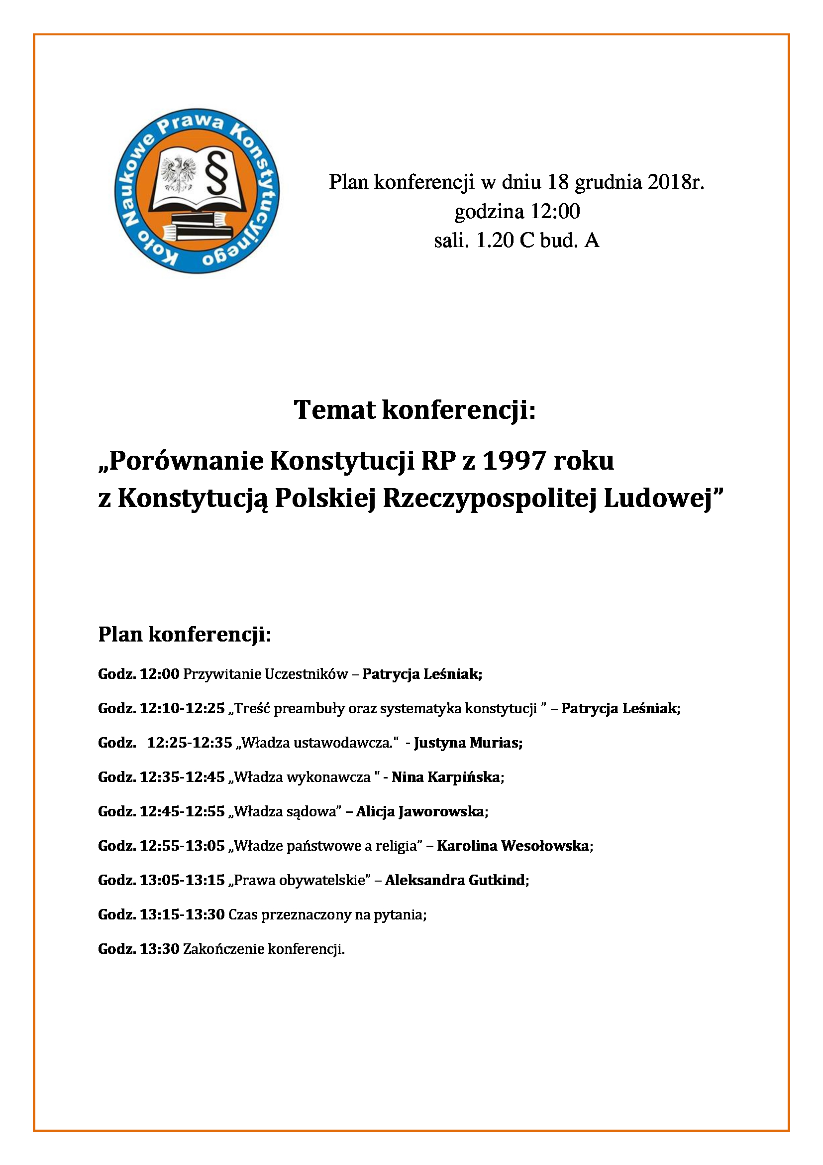 To nasze ostatnie spotkanie przed Świętami, a dedykujemy je porównaniu dwóch konstytucji. Zapraszamy do udziału. Czekamy na Was w sali 1.20 C w bud. A o godzinie 12:00. We wtorek oczywiście (18 grudnia).