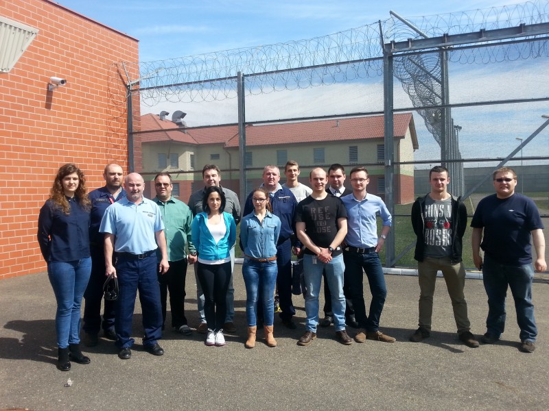 z roku na rok podejmuje się coraz więcej osadzonych, ogromnym zaskoczeniem było dla nas to, że na 1 skazanego przypada 1 strażnik. O godzinie 1130 dotarliśmy do celu. Tam przywitał nas dyrektor więzienia gen. bryg. László Mészáros. Po sprawdzeniu całej grupy przez strażników przeszliśmy do sali, gdzie przedstawiono nam, w formie prezentacji multimedialnej, najważniejsze informacje dotyczące zakładów karnych na Węgrzech. Przygotowano również dla nas mały poczęstunek oraz kawę. Następnie przeszliśmy do zwiedzania wnętrza więzienia. Mieliśmy okazję zobaczyć pracę więźniów, która polega m.in. na szyciu pościeli oraz obuwia. Kolejnym punktem zwiedzania była kaplica reformowana projektowana przez pana ElesaGiurge, znajduje się w niej wiele malowideł autorstwa więźniów. Nasz przewodnik podkreślił, że 30-40% osadzonych posiada jakiś talent m.in. malarski. Malowidła widniejące na ścianach kaplicy służą do edukacji religijnej. Z racji, iż tego dnia przypadała 5 rocznica katastrofy smoleńskiej, cała grupa wspólnie pomodliła się za ofiary poległe w tej katastrofie. Z kaplicy przeszliśmy do sali kultury, która również przyozdobiona jest malowidłami. W tej sali odbywają się przedstawienia organizowane przez grupy spoza zakładu, ale również przez samych więźniów. Kolejno zobaczyliśmy sale zajęć , gdzie więźniowie wykorzystują swoje talenty. W czasie zwiedzania byliśmy świadkami grypserki, podania pakunku z okna do okna. Po obejrzeniu kilku cel mieszkalnych, możemy stwierdzić, że są one mniej wyposażone niż w Polce, ale nie oznacza to, że osadzeni na Węgrzech żyją w gorszych warunkach. Wręcz przeciwnie, w salach panuje ład i porządek. Poznaliśmy także system zabezpieczeń okien i drzwi całego więzienia. Przeszliśmy korytarzami zakładu zwiedzając po drodze każde pomieszczenie do którego mieliśmy dostęp. Spotkaliśmy tez na swojej drodze więźniów prowadzonych przez strażników, co dla nas studentów było nowym doświadczeniem. Po obejrzeniu więzienia, wyszliśmy na zewnątrz gdzie podziękowaliśmy za życzliwe przyjęcie naszej grupy oraz zrobiliśmy pamiątkowe zdjęcia.