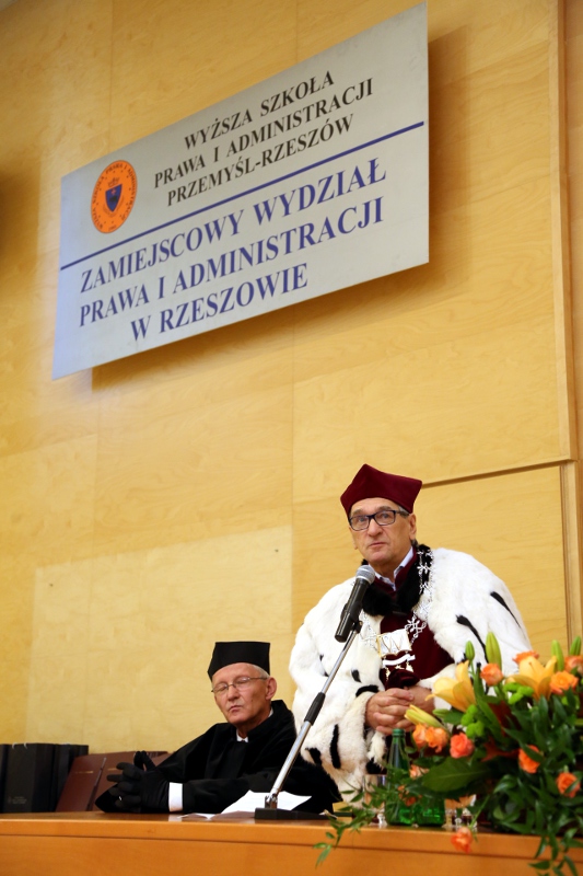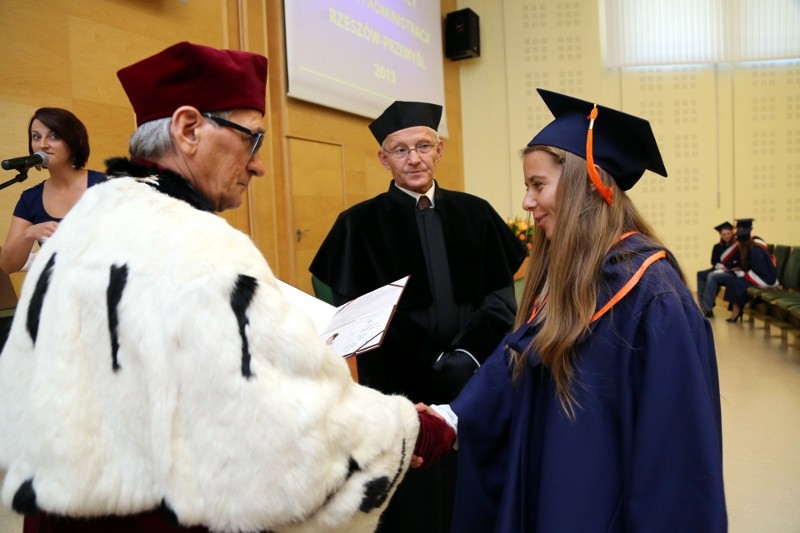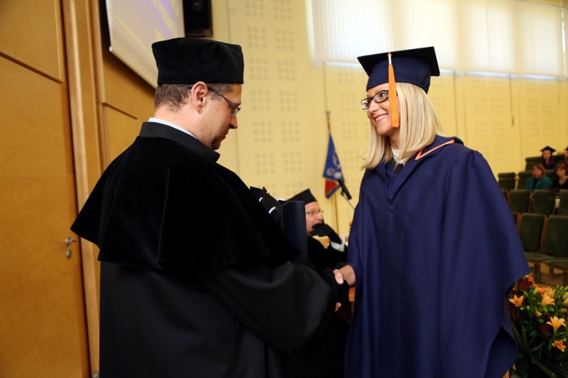 Wręczenie dyplomów ukończenia studiów rozpoczęło się punktualnie o godzinie 12:00 w Auli Collegium Adminstrativum WSPiA. Wszyscy absolwenci, ubrani byli w togi i birety. Podkreślało to podniosłą atmosferę uroczystości, w której uczestniczyły władze uczelni, kadra naukowo dydaktyczna oraz rodziny i znajomi Absolwentów.