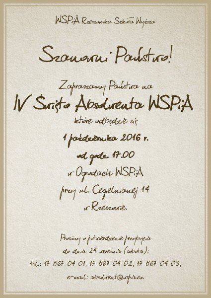Co bardzo ważne udział w Święcie Absolwenta WSPiA jest bezpłatny. Na miejscu dostępne będzie specjalne menu przygotowane przez restaurację „W ogrodach”. Aby wziąć udział w imprezie, należy jedynie potwierdzić swoja obecność w terminie do soboty 24 września 2016 r. Wystarczy zadzwonić na numer 17-867-04-01 lub 17-867-04-03. Potwierdzenie można również wysłać mailem na adres absolwent@wspia.eu.