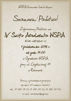 IV Święto Absolwentów odbędzie się w sobotę 1 października 2016 r. Impreza rozpocznie się w ogrodach wypoczynkowych WSPiA o godzinie 17:00. Tradycyjnie już rozpocznie je wykonanie pamiątkowego zdjęć wszystkich uczestników zjazdu. Później wszystkich absolwentów zapraszamy do wspólnej zabawy przy grillu i muzyce granej przez DJa.