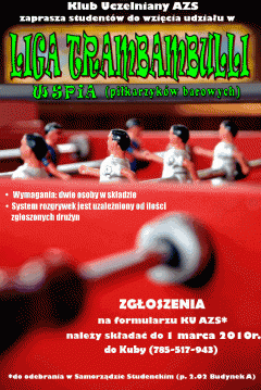 Do tej pory była to jedynie zabawa w chwilach wolnych od zajęć. Teraz rozpoczynamy „na poważnie”. KU AZS WSPiA organizuje Ligę Trambambuli (piłkarzyki barowe). To jedyna tego rodzaju Liga na rzeszowskiej akademickiej „scenie sportowej”.