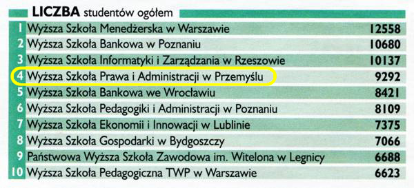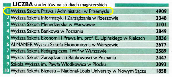W kategorii „Liczba studentów na studiach magisterskich w uczelniach niepublicznych” zajęliśmy pierwsze miejsce w Polsce. W kategorii „Ogólna liczba studentów (stacjonarni i niestacjonarni) – 4 miejsce. Jesteśmy też w pierwszej dziesiątce uczelni niepublicznych, które pomagają studentom oferując miejsca w domach akademickich.