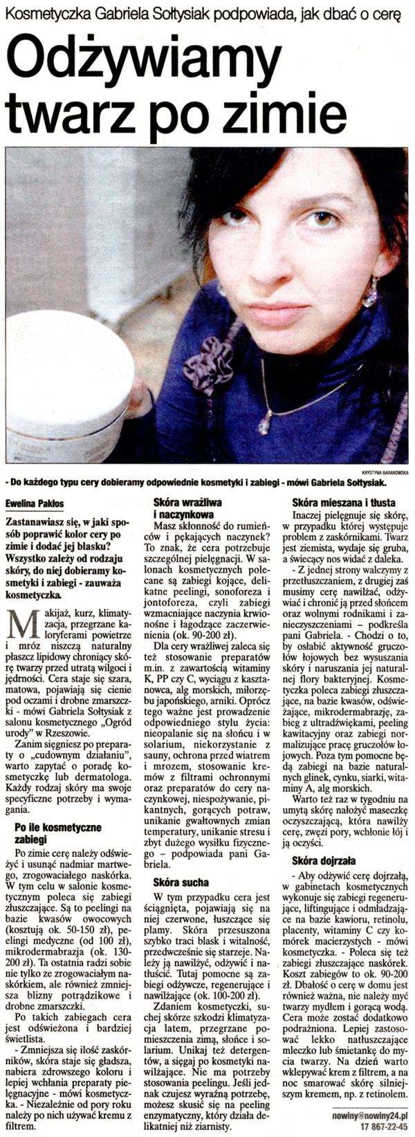 Ewelina zadebiutowała na łamach „Nowin” dużo wcześniej - krótkim tekstem informacyjnym dotyczącym problemu społecznego: czy pasażer wysiadający z autobusu powinien i może oddać bilet wsiadającemu. Obecnie, po nawiązaniu stałej współpracy, publikowała już swoje sondy przeprowadzane wśród mieszkańców Rzeszowa. Tekst, który dzisiaj się ukazał („Odżywiamy twarz po zimie”, str.11.) uznać można za „rasowy” tekst dziennikarski zarówno pod względem formy jak i zawartości. Artykuł z pewnością zainteresuje czytelniczki w całym województwie. Powstał na podstawie rozmowy z Gabrielą Sołtysiak, kosmetyczką z Rzeszowa. Dotyczy zasad zdrowej pielęgnacji cery.