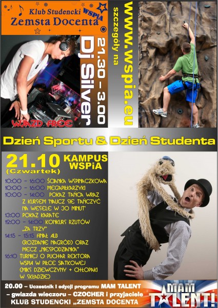 21.30 - 3.00 -dyskoteka Dj Silver (Rezydent klubu Retro w Częstochowie, gościł w takich klubach jak Czekolada-Chorzów, Taawa- Kraków) - Klub Studencki "Zemsta Docenta"