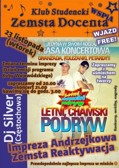 Samorząd Studencki WSPiA zaprasza na Andrzejki w klubie studenckim ZEMSTA DOCENTA. Najbliższy wtorek, 23 listopada. Gwiazdą wieczoru będzie zespół LETNI CHAMSKI PODRYW. WSTĘP WOLNY