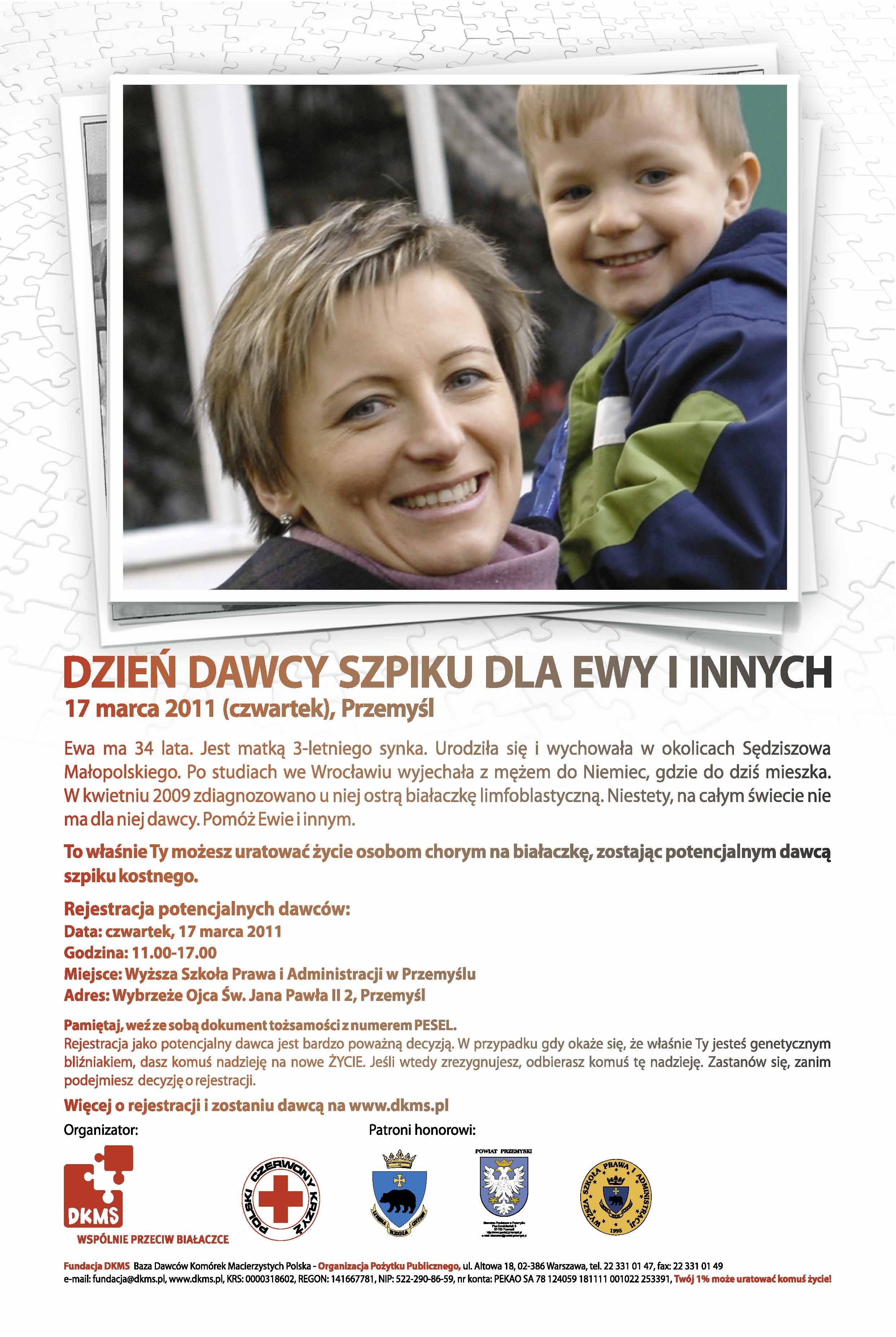 Ewa ma 34 lata. Jest matką 3-letniego synka. Urodziła się i wychowała w okolicach Sędziszowa Małopolskiego. Po studiach we Wrocławiu wyjechała z mężem do Niemiec, gdzie do dziś mieszka. W kwietniu 2009 zdiagnozowano u niej ostrą białaczkę limfoblastyczną. Niestety, na całym świecie nie ma dla niej dawcy.