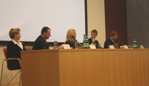 Na zdjęciu (od lewej): Dr Elżbieta Feret (Prodziekan WSPiA), Andrzej Czarnecki (Dyrektor Komunikacji WSK PZL-Rzeszów), Elżbieta Łukacijewska (Europosłanka), Tomasz Kłosowicz (Wiceprzewodniczący Stowarzyszenia Forum Młodych Dyplomatów), Jarosław Reczek (Pełnomocnik Wojewody Podkarpackiego).