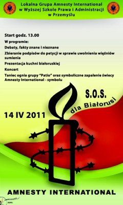 W czwartek (14.04) w Wyższej Szkole Prawa i Administracji w Rzeszowie rozpoczyna działanie Lokalna Grypa Amnesty International. Z tej okazji zapraszamy na konferencję „S.O.S dla Białorusi”.