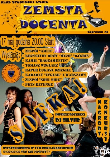 Studencki Ogólnouczelniany Festiwal Kultury Akademickiej rozpocznie się o godz. 20 w Klubie Studenckim WSPiA - „Zemsta Docenta”. Na scenie zagrają m.in. zespół "Amiti", Kabaret "Zygzak" z Warszawy, Zespół Soul Side, Pest Revenge oraz DJ Silver.