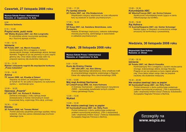 Festiwal „Watch Docs. Prawa Człowieka w Filmie” odbędzie się w siedzibie Wyższej Szkoły Prawa i Administracji w Rzeszowie (ul. Cegielniana 14). Będzie to już druga edycja „Watch Docs” w województwie podkarpackim.