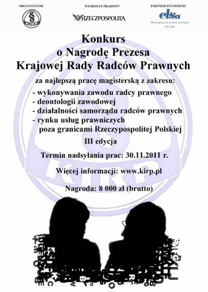 To już III edycja Konkursu o Nagrodę Prezesa Krajowej Rady Radców Prawnych na najlepszą pracę magisterską. Główną ideą konkursu jest popularyzacja tematyki organizacji i zasad działania samorządu radcowskiego oraz funkcjonowania zawodu radcy prawnego jako zawodu zaufania publicznego. W konkursie uczestniczyć mogą wszyscy absolwenci studiów wyższych, którzy są autorami prac magisterskich o wskazanej tematyce. Praca powinna być obroniona po 1 maja 2008 roku na ocenę co najmniej dobrą.