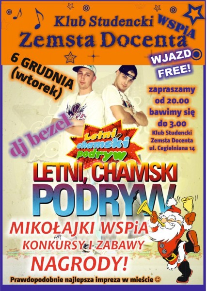 Już jutro (wtorek 06.12) w klubie studenckim „Zemsta Docenta” odbędą się Mikołajki WSPiA. Gwiazdą wieczoru będzie „Letni, Chamski Podryw”. Start imprezy o godzinie 20:00. Zapraszamy wszystkich studentów WSPA.