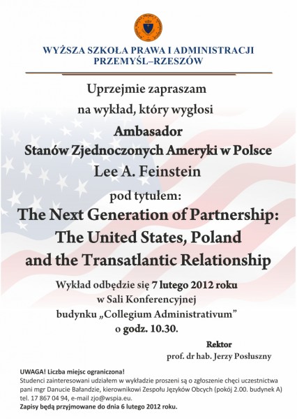 Prof. Jerzy Posłuszny, Rektor WSPiA zaprasza na wyjątkowy wykład, który wygłosi Ambasador Stanów Zjednoczonych Ameryki w Polsce Lee A. Feinstein. Tytuł wykładu to „The Next Generation of Partnership: The United States, Poland and the Transatlantic Relationship”. Wykład odbędzie się 7 lutego 2012 roku o godzinie 10:30 w Sali Konferencyjnej budynku „Collegium Administrativum”.