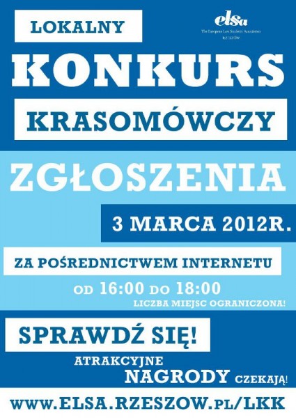 Już 3 marca studenci Wyższej Szkoły Prawa i Administracji będą mogli zgłosić się do Lokalnego Konkursu Krasomówczego. Ma on na celu wyłonienie studentów, którzy najlepiej radzą sobie z wystąpieniami publicznymi. Jego organizatorem jest Europejskie Stowarzyszenie Studentów Prawa ELSA Rzeszów. W poprzedniej edycji konkursu I miejsce zajął Maciej Pelc, student „prawa” w WSPiA.