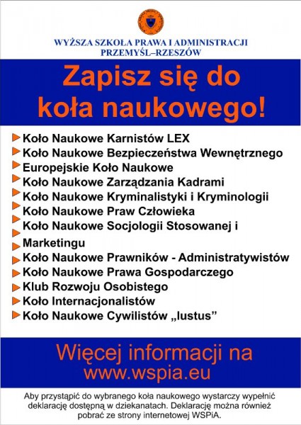 Uwaga!!! Nowa oferta dla studentów Wyższej Szkoły Prawa i Administracji. Oprócz już istniejących kół naukowych studenci będą mogli działać w nowopowstających organizacjach. Aby przystąpić do wybranego koła naukowego, wystarczy wypełnić specjalną deklarację dostępną w dziekanatach oraz na naszej stronie internetowej. Poniżej prezentujemy listę kół naukowych działających w WSPiA.