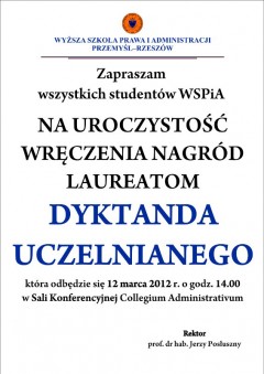 Wszystkich studentów WSPiA zainteresowanych udziałem w uroczystym wręczeniu nagród zapraszamy w najbliższy poniedziałek (12.03) o godzinie 14:00 do Sali Konferencyjnej (budynek A).