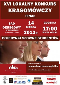 Organizatorem XVI Lokalnego Konkursu Krasomówczego jest Europejskie Stowarzyszenie Studentów Prawa ELSA Rzeszów. W poprzedniej edycji I miejsce zajął Maciej Pelc, student V roku „prawa” w Wyższej Szkole Prawa i Administracji.