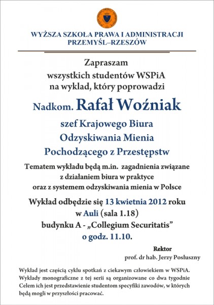 W najbliższy piątek (13.04) studenci kierunku „bezpieczeństwo wewnętrzne” w WSPiA wezmą udział w kolejnym spotkaniu z ciekawym człowiekiem. Wykład wygłosi mł. insp. Rafał Woźniak, szef Krajowego Biura Odzyskiwania Mienia Pochodzącego z Przestępstw. Spotkanie rozpocznie się w piątek (13.04) o godzinie 11:10 w auli Wyższej Szkoły Prawa i Administracji (sala 118, budynek A).