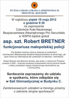 Asp. szt. Robert Bretner będzie gościł w Wyższej Szkole Prawa i Administracji na zaproszenie Członków Koła Naukowego Bezpieczeństwa Wewnętrznego Pro Securitatis działającego w uczelni. Funkcjonariusz małopolskiej policji w czasie dyskusji opowie m.in. o sporcie jako alternatywie dla uzależnień od alkoholu i narkotyków. Przeprowadzi również trening technik karate, a także przedstawi zasady bezpiecznego obchodzenia się z bronią palną.