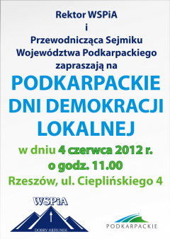Rektor WSPiA prof. Jerzy Posłuszny oraz Teresa Kubas-Hul, Przewodnicząca Sejmiku Województwa Podkarpackiego zapraszają na Podkarpackie Dni Demokracji Lokalnej. Impreza odbędzie się 4 czerwca w Urzędzie Marszałkowskim Województwa Podkarpackiego. W ramach PDDL zorganizowane zostaną m.in. wykłady, panele dyskusyjne oraz prelekcji i warsztatów skoncentrowanych na problematyce samorządu terytorialnego. Dodatkowa atrakcja będzie konkurs dla studentów i licealistów.