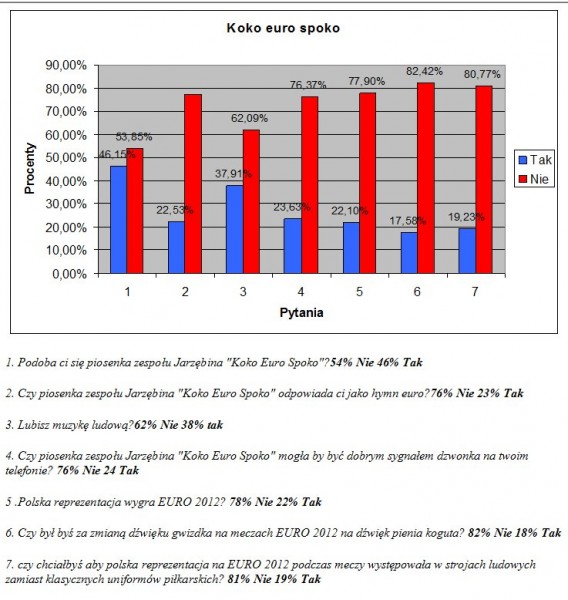 Badania prowadzone były głównie na terenie Wyższej Szkoły Prawa i Administracji. Według mgr. Lecha Żukowskiego, opiekuna Klubu Rozwoju Osobistego na podstawie zebranych wyników można stwierdzić, że mimo wyraźnego podzielenia, co do oceny samej piosenki (54%- pozytywnie 46%- negatywnie) zdecydowana większość ankietowanych nie widzi jej jako hymnu Euro 2012 (76% Nie, 23% Tak). – Ankietowani nie chcą też tej piosenki jako dzwonka do własnego telefonu (76% Nie, 24 Tak) oraz nie życzy sobie dalszego zwrotu polskiej piłki w kierunku „ludowym”. Jednocześnie 38% ankietowanych twierdzi, że lubi muzykę ludową – tłumaczy mgr Lech Żukowski.