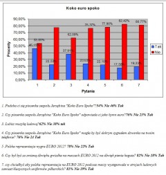 Ankietowani krytycznie odnieśli się też do pomysłu zmiany sygnału gwizdka sędziego na dźwięk pienia koguta (82% Nie, 18% Tak) oraz zmiany strojów piłkarskich na odzież ludową (81% Nie, 19% Tak). – Ocenie poddaliśmy również szanse wygrania Euro 2012 przez nasza reprezentację. Tu ankietowani byli nastawieni pesymistycznie. Aż 78% badanych nie wierzy w nasz triumf – mówi mgr Lech Żukowski. Dodaje, iż można zaryzykować stwierdzenie, że tylko ok. 1/5 ankietowanych studentów pozostaje zadowolona z „ludowego” charakteru Euro 2012 oraz z optymizmem patrzy na przyszłość Polskiej piłki nożnej.