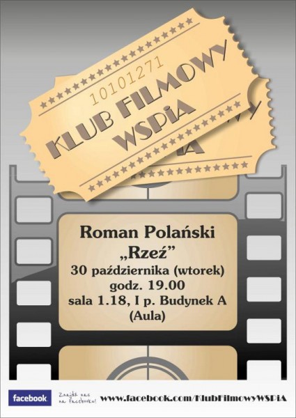 We wtorek 30 października 2012 r. w Wyższej Szkole Prawa i Administracji rusza Dyskusyjny Klub Filmowy. Na początek studenci WSPiA będą mogli zapoznać się z twórczością Romana Polańskiego. Po filmie przewidziano czas na dyskusję. Osoby zainteresowane uczestnictwem w Dyskusyjnym Klubie Filmowym WSPiA zapraszamy o godz. 19:00 do sali 1.18 w budynku A przy ul. Cegielnianej 14 w Rzeszowie.