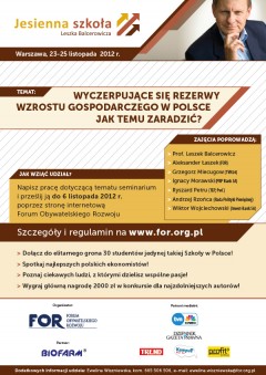 Jeszcze do 6 listopada studenci Wyższej Szkoły Prawa i Administracji mogą zgłaszać się do „Jesiennej Szkoły Leszka Balcerowicz”. Wystarczy napisać pracę konkursową na temat „Wyczerpujące się rezerwy wzrostu gospodarczego w Polsce. Jak temu zaradzić?”. Nagroda za najlepszą pracę to 2000 zł. Jesienna Szkoła Leszka Balcerowicza to trzydniowe seminarium organizowane już po raz siódmy przez Forum Obywatelskiego Rozwoju. Odbędzie się w dniach 23-25 listopada 2012 r. w Warszawie.