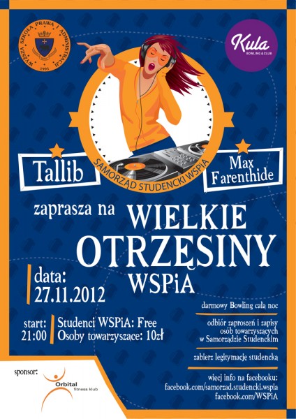 Już w najbliższy wtorek (27.11) zapraszamy wszystkich studentów pierwszego roku studiów w WSPiA na Wielkie Otrzęsiny. Impreza odbędzie się w rzeszowskim klubie, kręgielni „Kula”. Gwiazdą wieczoru będzie Tallib i DJ Max Farenthide. Strat imprezy o godzinie 21:00. Wstęp dla studentów WSPiA za darmo. Zapraszamy.