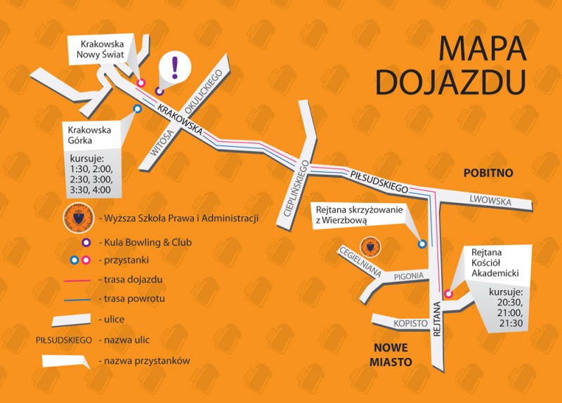 Klub i kręgielnia „Kula” znajduje się w Galerii Nowy Świat przy ul. Krakowskiej. Studentów WSPiA za darmo na imprezę przywiozą specjalne autobusy. Kursy zaplanowano z Rejtana (przed Kościołem Akademickim) o godzinach 20:30, 21:00 i 21:30. Z powrotem autobusy będą kursować co półgodziny od 1:30 4:00 rano.
