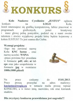 Koło Naukowe Cywilistów IUSTUS ogłasza konkurs na swoje LOGO. Do udziału w konkursie zapraszamy wszystkich studentów Wyższej Szkoły Prawa i Administracji. Wystarczy stworzyć Logo, które będzie zawierać nazwę Koła Naukowego Cywilistów IUSTUS oraz nazwę Uczelni. Prace można nadsyłać do 28 lutego 2013 r. Zapraszamy do udziału!