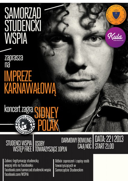 Sidney Polak będzie gwiazdą zbliżającej się imprezy karnawałowej dla studentów Wyższej Szkoły Prawa i Administracji. Zabawa odbędzie się w najbliższy wtorek 22 stycznia w rzeszowskim klubie, kręgielni „Kula”. Oprócz koncertu studenci przez całą noc będą mogli za darmo zagrać w kręgle. Strat imprezy o godzinie 21:00. Wstęp dla studentów WSPiA za darmo. Zapraszamy.