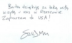S.M.: Nigdy wcześniej nie byłem w tych stronach, w Rzeszowie. Bardzo chciałem odwiedzić miejsce, w którym jeszcze nie byłem. Odwiedziłem też Mielec i muszę przyznać, że tamtejsza fabryka PZL – Sikorsky jest imponująca. Co więcej jest ona świetnym przykładem współpracy gospodarczej między USA a Polską, ponieważ wykorzystuje się tam zarówno polskie jak i amerykańskie technologie. To dobry znak na przyszłość i cieszy fakt, iż tyle dzieje się w tym regionie. Wiele pozytywnych wrażeń wyniosłem także ze spotkania z Prezydentem Rzeszowa, który prowadzi politykę zarządzania miastem w sposób bardzo postępowy. Żałuje, że nie byłem na Podkarpaciu nigdy wcześniej, ale na pewno jeszcze tu wrócę.