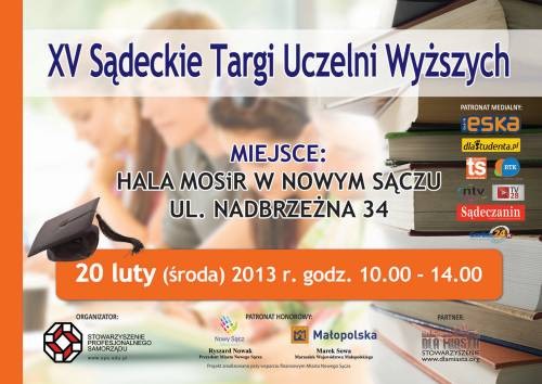 XV Sądeckie Targi Uczelni Wyższych odbędą się 20 lutego 2012 (środa) w hali sportowej Miejskiego Ośrodka Sportu i Rekreacji w Nowym Sączy przy ul. Nadbrzeżnej 34. Do odwiedzania stoiska WSPiA zapraszamy od godziny 10:00 do 14:00.
