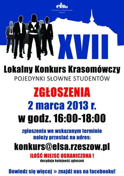 XVII edycja Lokalnego Konkursu Krasomówczego organizowana jest przez Europejskie Stowarzyszenie Studentów Prawa ELSA Rzeszów. Konkurs odbędzie się 13 marca 2013 r. w Sali Teatralnej Sądu Okręgowego w Rzeszowie.