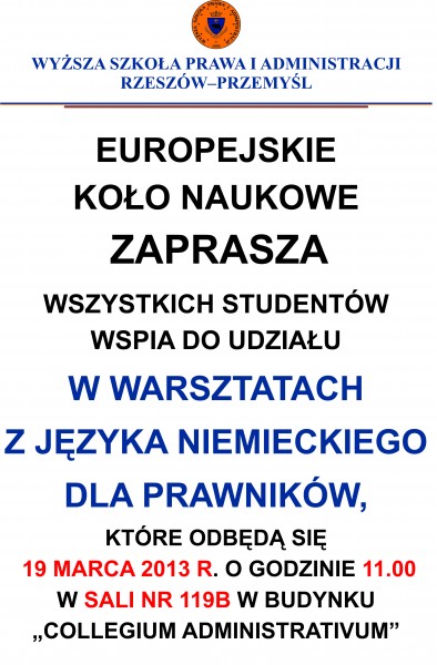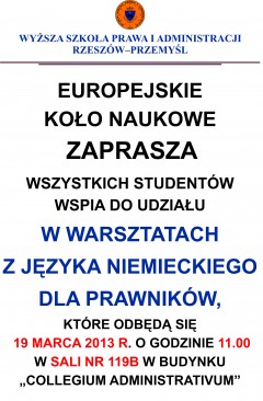 Już w najbliższy wtorek 19 marca o godzinie 11:00 zapraszamy wszystkich studentów na warsztaty z języka niemieckiego dla prawników. Warsztaty, które odbędą się w Sali 119B (budynek A) poprowadzi dr Magdalena Kędzior, wykładowca WSPiA. Organizatorem spotkania jest Europejskie Koło Naukowe działające w naszej uczelni.