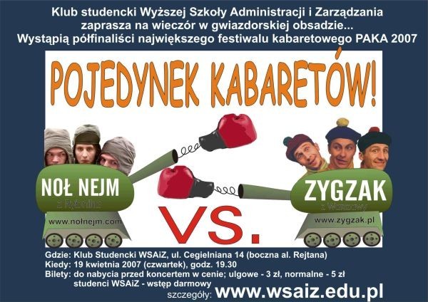 Klub studencki WSAiZ zaprasza na pojedynek kabaretowy. Wystąpią tegoroczni półfinaliści największego festiwalu kabaretowego PAKA 2007: kabaret Zygzak z Warszawy oraz NołNejm z Rybnika, a publiczność wybierze zwycięzcę!