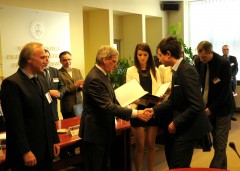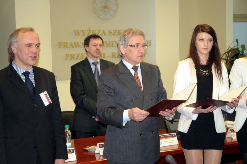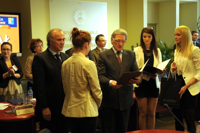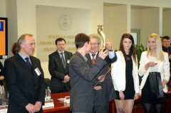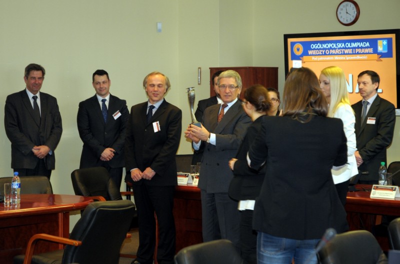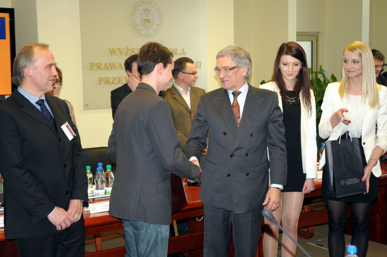 Laureaci Ogólnopolskiej Olimpiady Wiedzy o Państwie i Prawie nagrody otrzymali z rąk prof. Jerzego Posłusznego, Rektora WSPiA; prof. Andrzeja Zolla, wykładowcy WSPiA oraz prof. Andrzeja Witkowskiego, przewodniczącego Komisji Centralnej Olimpiady.