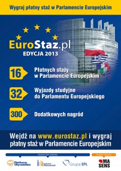Uwaga studenci ruszyła kolejna edycja konkursu „EuroStaż”. Do wygrania jest 16 płatnych staży w Parlamencie Europejskim, 32 wyjazdy studyjne oraz nagrody rzeczowe. Wystarczy do 16 kwietnia 2013 r. rozwiązać test z wiedzy na temat Unii Europejskiej. Organizatorami konkursu jest Platforma Obywatelska, Instytut Obywatelski oraz Grupa Europejskiej Partii Ludowej w Parlamencie Europejskim. W ubiegłym roku finalistką konkursu została studentka WSPiA - Katarzyna Martko.