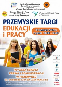 Przemyskie Targi Edukacji i Pracy odbędą się 12 kwietnia 2013 r. w godz. od 10:00 do 14:00 w Wyższej Szkole Prawa i Administracji w Przemyślu ul. Wybrzeże Ojca Świętego Jana Pawła II 2.