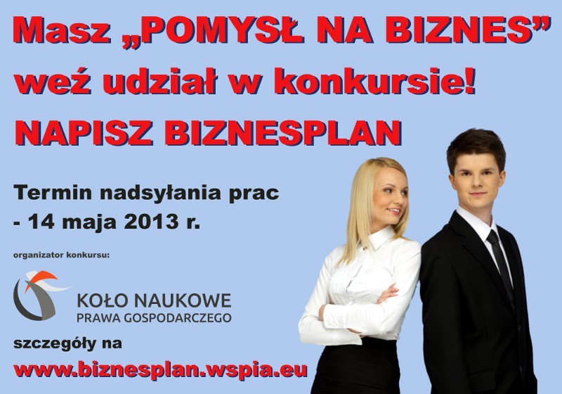 Koło Naukowe Prawa Gospodarczego działające w WSPiA zaprasza do udziału w konkursie „Pomysł na biznesplan”. Wystarczy w terminie do 14 maja 2013 r. przesłać do organizatorów swój projekt biznesplanu. Najciekawsze propozycje zostaną nagrodzone. Rozstrzygnięcie konkursu odbędzie się 22 maja podczas Konwentu Pracodawców Wyższej Szkoły Prawa i Administracji.