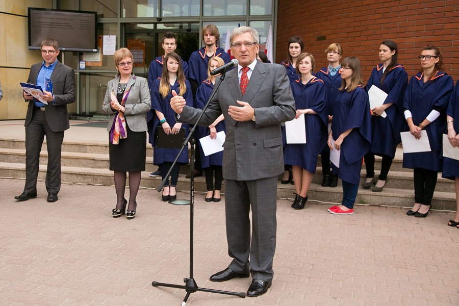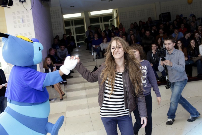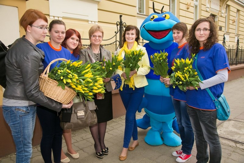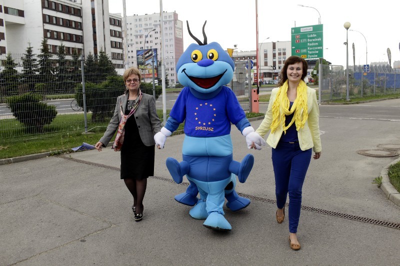 W akcji rozdawania tulipanów uczestniczyli m.in. mgr Teresa Kubas-Hul – pełnomocnik Rektora WSPiA ds. Unii Europejskiej, studenci WSPiA, pracownicy działającego przy uczelni Punktu Informacji Europejskiej Europe Direct oraz Syriusz – maskotka Komisji Europejskiej.