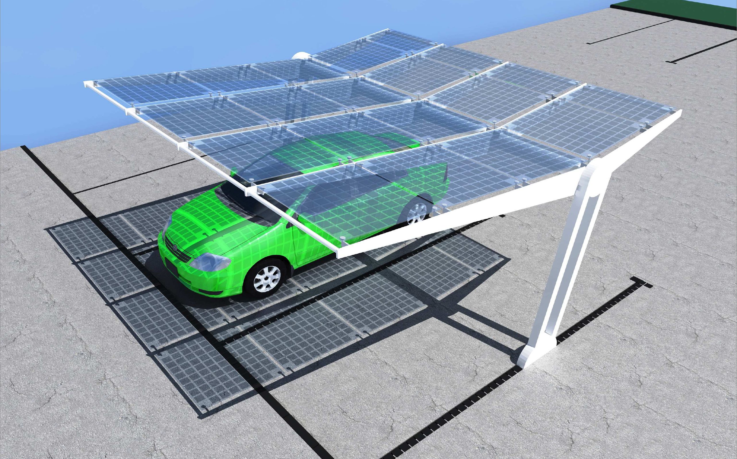 Wizualizacja "Car Portów" z panelami fotowoltaicznymi na parkingu WSPiA.