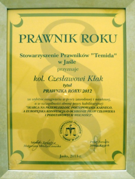 Tytułu ”Prawnika Roku” przyznany został prof. Czesławowi Kłakowi za wybitne osiągnięcia w pracy naukowej. Jak podkreślają członkowie kapituły przyznającej wyróżnienie praca wykładowcy WSPiA ma ogromne znaczenie dla praktyki wymiaru sprawiedliwości. Nagroda została przyzna także, jako wyraz uznania za uzyskanie stopnia naukowego doktora habilitowanego nauk prawnych w wieku 31 lat.