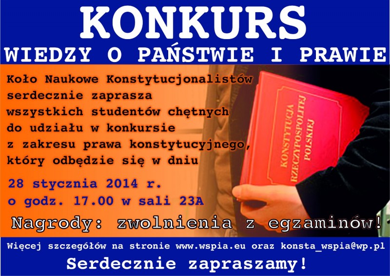 W konkursie z zakresu prawa konstytucyjnego uczestniczyć mogą wszyscy studenci Wyższej Szkoły Prawa i Administracji. Konkurs odbędzie się w formie testu przygotowanego przez członków Koła Naukowego Konstytucjonalistów pod opieką dr. Łukasza Buczkowskiego. Dla najlepszych studentów przewidziano nagrody. Będą to zwolnienia z egzaminów z przedmiotów: Prawo konstytucyjne, Zasady ustroju politycznego państwa i Nauka o państwie i prawie.