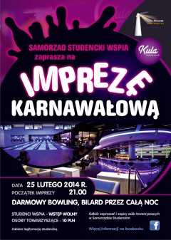 Organizatorem imprezy Karnawałowej w klubie „Kula” jest Samorząd Studencki WSPiA. Wstęp na imprezę dla studentów naszej uczelni, jak zawsze jest darmowy. Po odbiór zaproszeń oraz zapisy osób towarzyszących zapraszamy do pokoju Samorządu Studenckiego WSPiA. Pamiętajcie, aby na Imprezę Karnawałową WSPiA 2014 zabrać Legitymację Studencką.